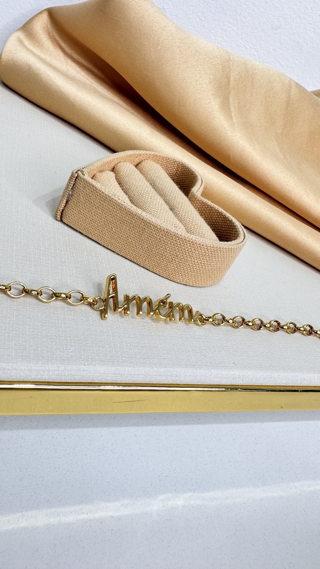 Encante-se com a Pulseira Amém Verniz Italiano, uma peça que une delicadeza e sofisticação. Produzida com banho de ouro 3 milésimos e acabamento em verniz italiano, oferece brilho intenso e durabilidade.